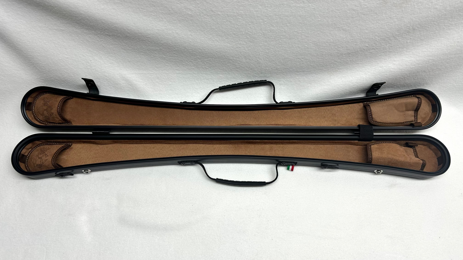 Custodia per arco da basso francese, per due archi, carbonio a vista, finitura rugiada, interno color castagno.