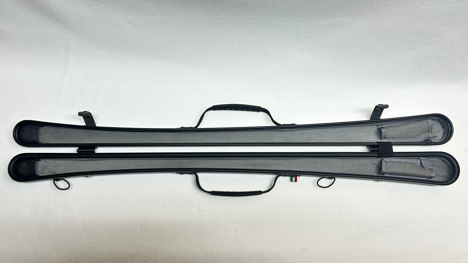 Custodia per violino e porta arco, per due archi, colorata, finitura lucida, interno color grigio.