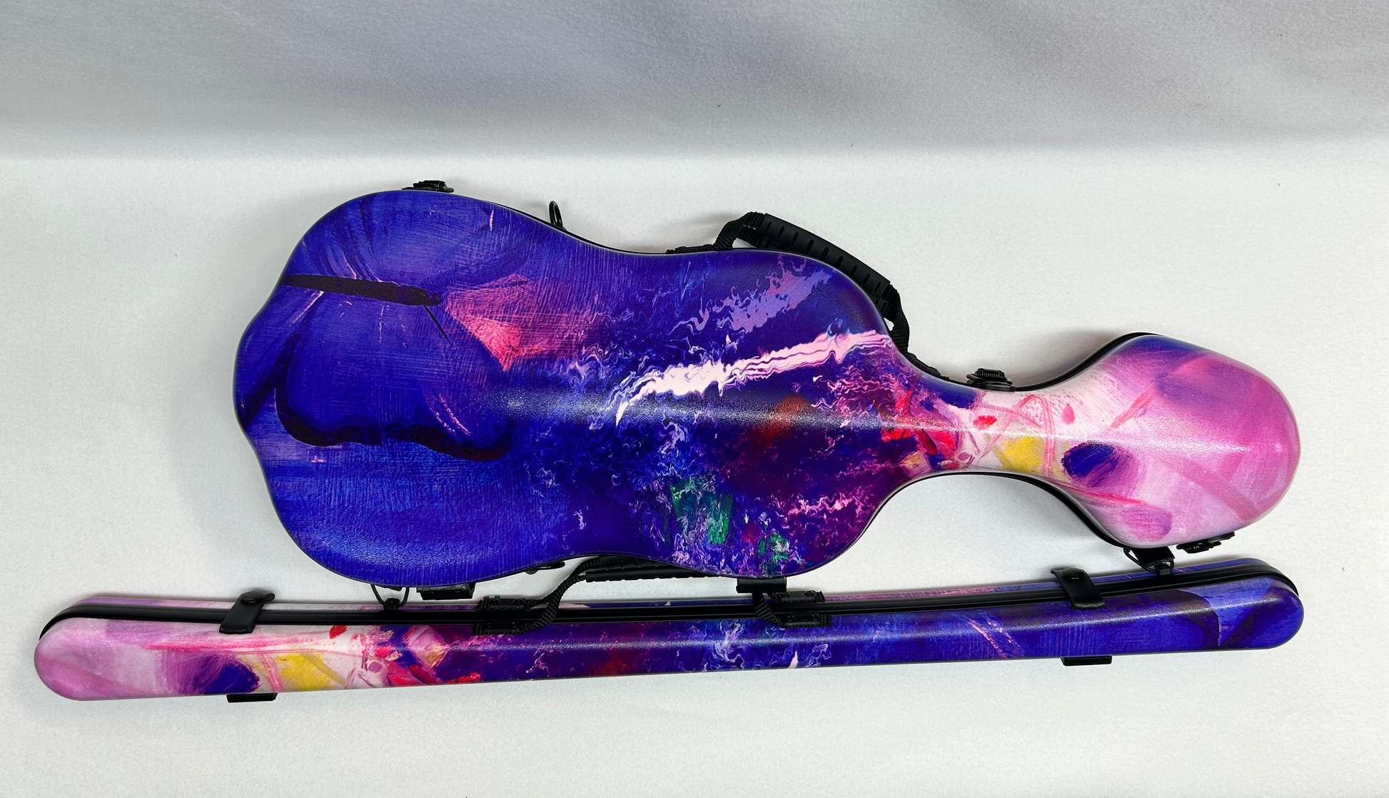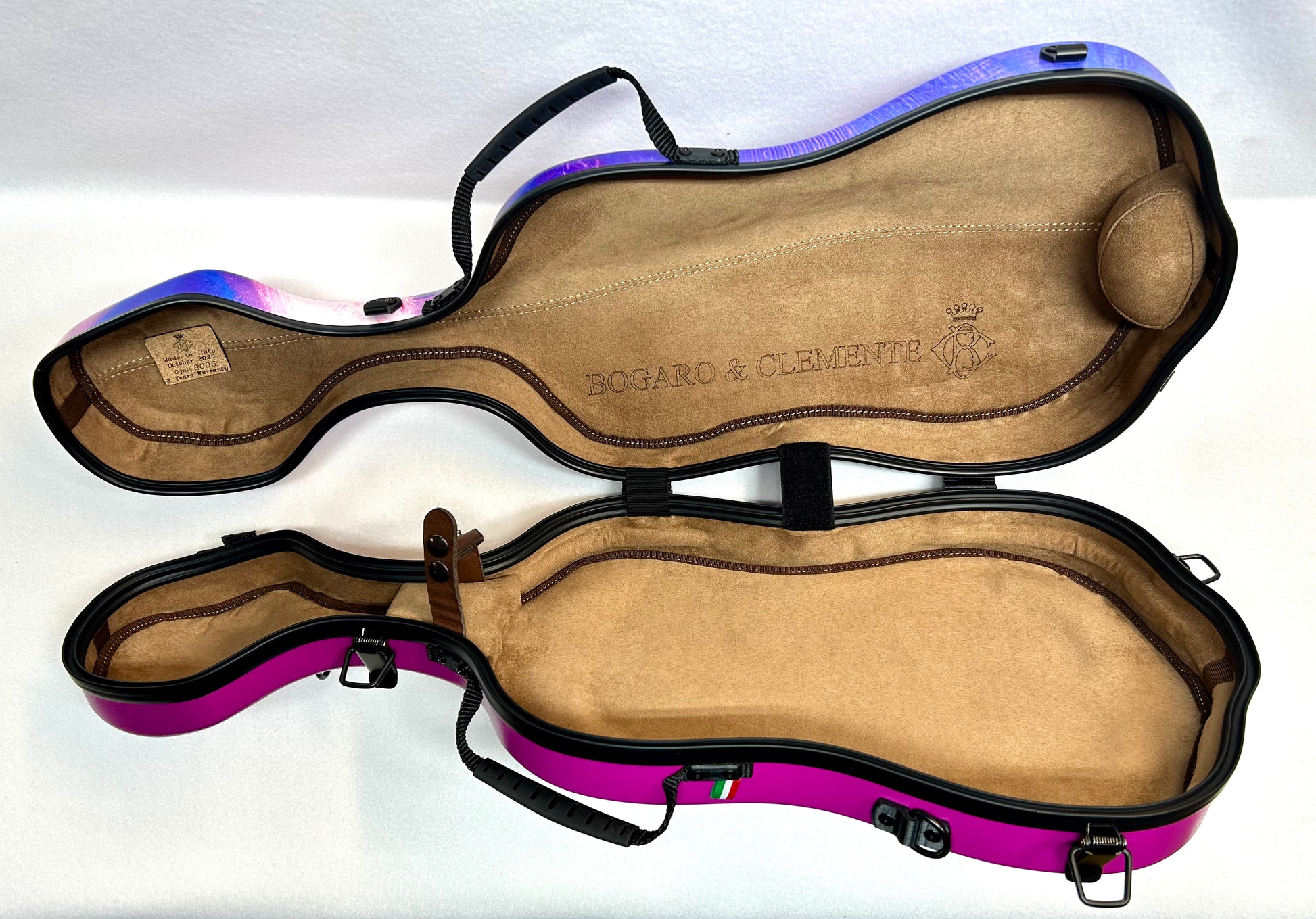 Custodia per violino e porta arco, per due archi, stampa Purple Butterfly, finitura lucida, interno color castagno.