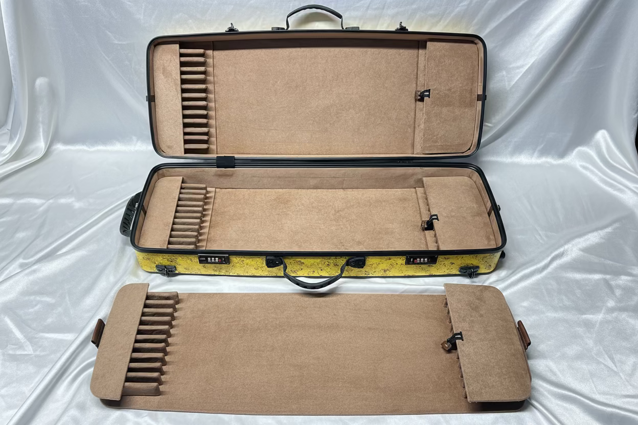 L’interno è organizzato con una rastrelliera sul fondo e una sul coperchio, ciascuna in grado di alloggiare fino a 13 archi. Due pannelli divisori, uno per il fondo e uno per il coperchio, offrono ulteriori spazi per 6 archi ciascuno, garantendo una disposizione pratica e sicura per un totale di 38 archi.