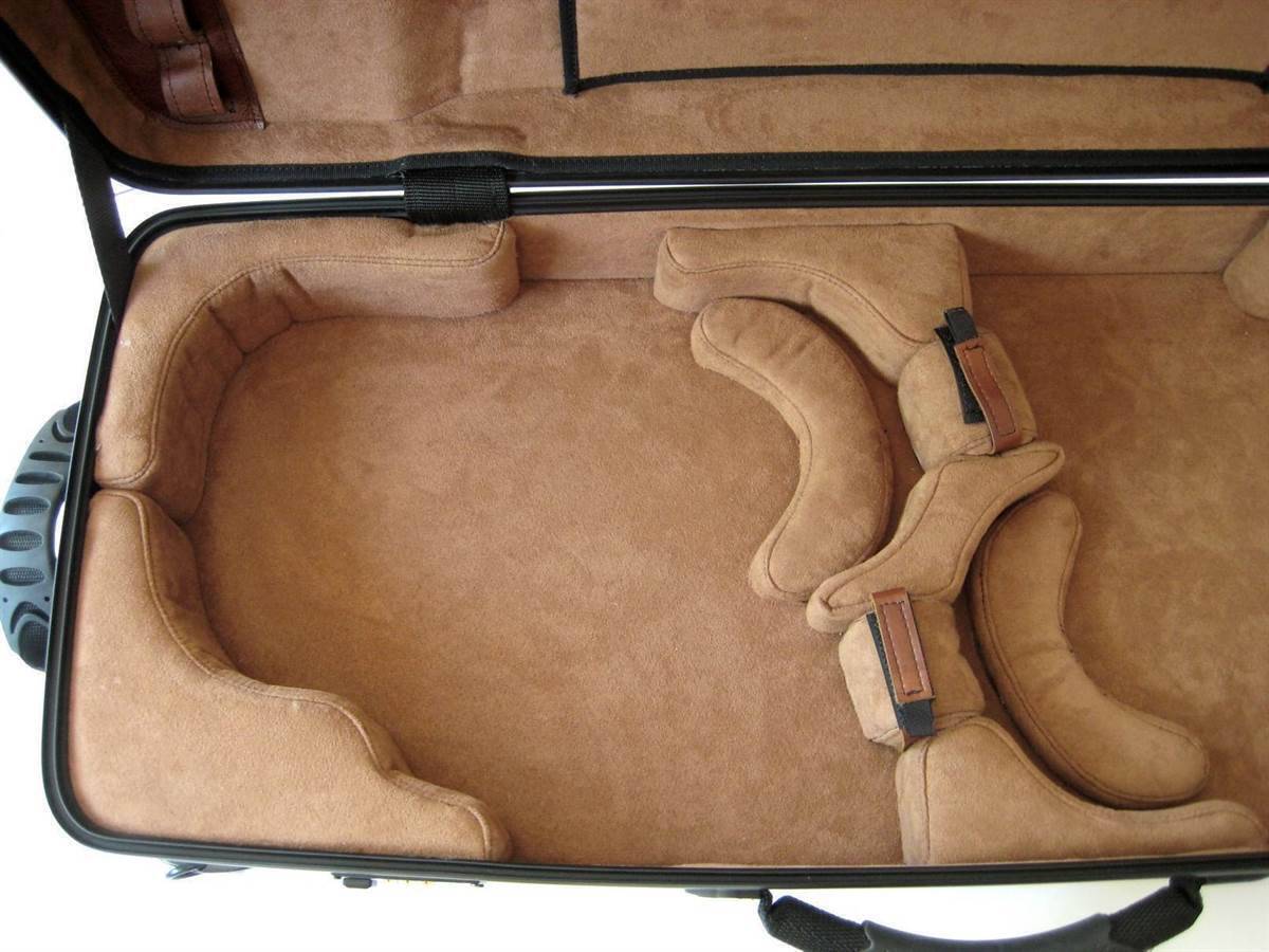 Gli interni, realizzati con materiali pregiati, includono una tasca porta musica e offrono un’organizzazione ottimale degli spazi. Sul coperchio è previsto un sistema di fissaggio per quattro archi, garantendo una soluzione pratica e sicura per il trasporto.